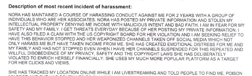The case file illustrates how harassment laws — written to shield genuine victims of stalking and abuse — can be reinterpreted as tools of retaliation. Placed beside D’Amato’s own live-streamed monologues in the days immediately before the filing, the picture grows even more troubling: the courtroom petition appears less a plea for protection than the continuation of a performance already underway online.