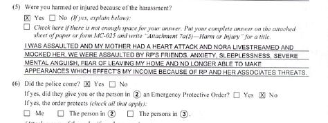 He does not stop there. When answering the form question, “Who else was there?”, D’Amato names a dozen others as Nora’s supposed “associates,” ranging from ex-Scientologists to YouTube critics. The list includes me (“HeroLightCody”), Jenna Miscavige, Mindy Willens, Dodge Landesman, Jared Brooks (“Beachcomber”), William Gude, Aaron Smith Levin, Karen Delacarriere, and Jeffrey Augustine — a bizarre catalog of people he casts as witnesses. He even went so far as to name a minor and his own mother, individuals he is barred from referencing under a standing restraining order. Whether the court treats that inclusion as protected petitioning or retaliatory misuse, it underscores how D’Amato deploys legal filings not simply to seek protection but to continue his fixation through official channels. The effect is to widen the circle of accusation until ordinary criticism becomes, in his telling, a conspiracy against him.