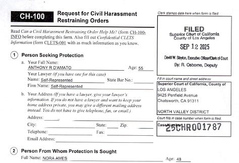 On September 12, 2025, Anthony R. D’Amato — better known online as “ZeroDarkTony” — walked into Los Angeles Superior Court and filed a civil harassment restraining order against Nora Ames, an Oregon-based content creator and, like many of his chosen adversaries, a former Scientologist. In doing so, he continued a familiar pattern for anyone who has followed the darker edges of his feuds: transforming conflicts he himself provokes into courtroom battles where he recasts himself as both a victim and a hero.