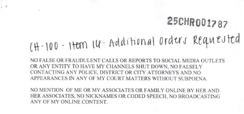Court filings and restraining orders became talking points, folded seamlessly into his online persona. He narrated the legal process as though it were a serialized drama, boasting of his petition while simultaneously continuing to taunt and insult the very person he claimed to fear. The contradiction was striking: having asked the court to silence Ames, he kept her alive as a character in his show. The restraining order did not end anything — it opened a new chapter, one where the government itself becomes a player in his performance.
